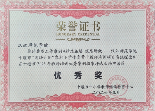 近日,十堰市中小学教师继续教育中心公布了2025年教师培训优秀案例征集评选活动结果,我校报送的典型工作案例《精准施培 提质增效——汉江师范学院十堰市“国培计划”农村小学体育骨干教师培训项目实践探索》荣获“优秀奖”。该项目由继续教育学院统筹谋划,体育学院组建高水平专家团队组织实施,案例全面总结了我校在2025年承接实施“国培计划(2025)——十堰市农村中小学学科骨干教师培训(小学体育)项目”中的创新实践与显著成效,得到评审专家的高度认可和一致好评。